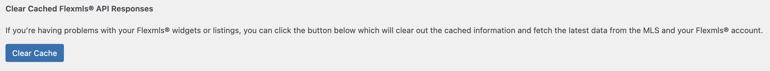 New IDX Links Are Not Displaying In The Plugin You can clear the cache in the Flexmls plugin settings to refresh the IDX link list. Navigate to FlexmlsIDX > Caching or FlexmlsIDX > Settings > Clear Cache, click the button Clear Cache