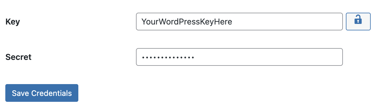 Enter in the key/secret provide to you in the getting started email and hit 'Save Credentials' This will lock them in.
