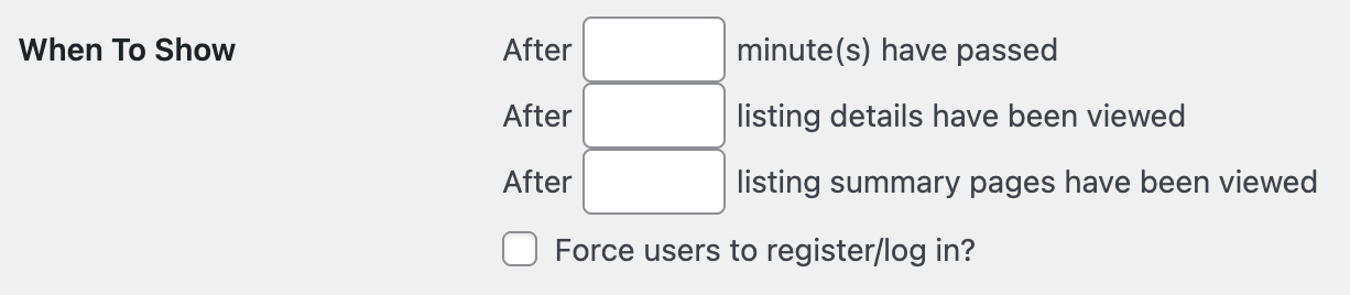 When to show: With this setting you will be able to set when your visitors will be asked to register/login. You can also force users to register/login